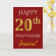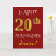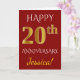 Este simples design de cartão de aniversário de casamento personalizado apresenta a mensagem "FELIZ ANIVERSÁRIO DE 20 ANOS", com o "20º" tendo uma aparência semelhante a ouro falso. A frente também apresenta um nome personalizado e um fundo de cor vermelha. O interior apresenta uma mensagem de aniversário de casamento personalizada. Pode ser dado a um marido ou esposa em celebração do vigésimo aniversário de casamento do casal. [~Z0000078]