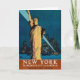 Viagens vintage de poster para Nova Iorque, mostrando a Estátua da Liberdade com barcos, linha do horizonte e luz de busca à distância, por volta de 1927.