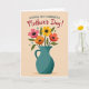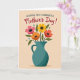 This card shows a deep teal pitcher with a light speckled texture sitting in the lower half of the design, like a cherished vase set out for someone special. From the narrow neck rises a full bouquet of stylized flowers in fuchsia, marigold yellow, fiery orange, and poppy red, with dark dotted centers that feel like little points of attention ❤️. Deep green leaves weave between the blooms, leaning toward each other as if in a gentle, friendly embrace. Small teal and olive dots drift around the bouquet like soft confetti, adding a light, airy touch 🌼. The background is a warm beige that keeps the scene calm while letting the colors stand out. Near the top, a short message appears in flowing crimson lettering, centered above the flowers and easy to spot at first glance. The pitcher’s rounded body and curved handle are shaded subtly, and the bouquet spreads upward in a loose, rounded shape with dots scattered in the open space around it.