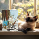 Um gato da floresta norueguesa está sentado ao lado de uma árvore com um dragão azul sentado em um capacete de batalha, neve ao redor deles e uma espada atrás deles com um machado de batalha viril ao lado deles