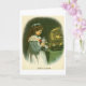 Uma ilustração vintage intitulada "Lição de Kittie" com uma garotinha segurando seu gatinho até a gaiola canária na esperança de que ela possa ensinar o gatinho a não prejudicar as aves. A placa é vazio de dentro para a sua mensagem manuscrita.