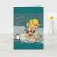 Cartão de aniversário com garotinha e um gatinho em uma cozinha antiga.