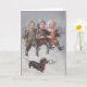 Uma ilustração vintage de três meninos marchando pela neve lado a lado em um dia de inverno, com os braços entrelaçados. Eles estão cantando uma canção enquanto a neve cai. Um cachorro Dachshund de estimação está logo à frente deles carregando um ramo de azevinho na boca. A mensagem dentro do cartão é: "Que o seu Natal brilhe com momentos de amor, risadas e boa vontade."