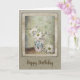 Daisy e o buquê Lace da Rainha Anne em um jarro vintage com quadros antigos para aniversário. O texto é editável.