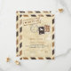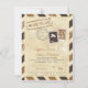 Cartão Save the Date inspirado em Airmail em tons Vintage de Marrom Escuro e Claro. Selo Falso e Marcações de Postagem para um Casamento Temático de Viagem.