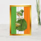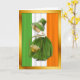 Uma Rua doce e vintage. Cartão do Dia de Patrick com uma adorável garota vitoriana vestida de vestido verde longo e capota verde, segurando uma cesta, em frente à bandeira irlandesa. Há uma borda de ouro em volta dela. A mensagem dentro diz: "Feliz Rua. Dia de Patrick" (que pode ser personalizado para o que você quiser, ou removido inteiramente se quiser).