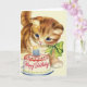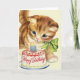 Cartão de saudação de aniversário retrô/vintage. Adorável gatinho de olhos azuis soprando velas em um bolo de aniversário! Feliz aniversário!