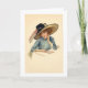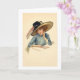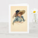 Uma ilustração vintage de uma adorável senhora sentada numa mesa com caneta na mão e anotando papel na frente dela. Ela parece perdida de pensamento enquanto decide a redação perfeita para a carta ou nota que está escrevendo. Ela veste um vestido azul-claro e um chapéu largo e largo adormecido com penas. Este cartão é vazio de dentro para sua própria mensagem.