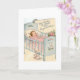 Uma imagem de cartão de saudação vintage apresenta um bebê dormindo em um berço azul pastel com um cobertor rosa. A frente do cartão diz "Melhores Desejos para Bebê - e Parabéns." A mensagem dentro do cartão é "Desejando alegria e felicidade, e muitos momentos maravilhosos juntos."