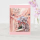 Uma imagem de cartão de saudação vintage apresenta um gato adorável vestindo uma fita rosa. Ela se senta sobre a janela cercada por cortinas rosas e rochosas, com vista para o exterior, para além. A frente do cartão diz, "Obrigado pela Hospitalidade" e a mensagem dentro do cartão é, "Obrigado por ser tão gentil e generoso."