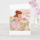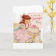 Uma imagem vintage do cartão de aniversário de uma neta mostra uma garotinha em seu bonito vestido de festa rosa e listrado branco. Ela se senta animada em frente a uma pequena mesa segurando um bolo de aniversário decorado com velas e rosas cor-de-rosa. A frente do cartão diz, "Para uma netinha doce no aniversário dela." A mensagem dentro do cartão é: "No seu dia especial, que as mais bonitas e doces surpresas apareçam no seu caminho."