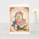 Uma imagem de cartão de saudação vintage apresenta um novo bebê adorável escondido em uma cesta azul mais veloz com cama rosa e branca. Um grande arco rosa está preso à alça da cesta. Ao lado da cesta há um ursinho de pelúcia recheado e um brinquedo de puxar pato amarelo. Flores cor-de-rosa e azuis decoram cada canto da imagem. A frente do cartão diz "Parabéns e boas-vindas" e a mensagem dentro da carta é "Bem-vindo ao mundo, pequenino. Que você seja sempre mantido seguro e rapado."
