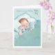 Uma imagem de cartão do vintage caracteriza um bebé doce snuggled sob uma cobertura azul na cama, som adormecido. Um branco distorcido encheu o cão com os olhos pretos do botão e o nariz é dobrado dentro ao lado dele. A parte dianteira do cartão diz que os "parabéns em seu bebé" e na mensagem dentro do cartão "lhe estão desejando muita felicidade enquanto você dá boas-vindas a seu pacote pequeno novo de alegria em sua família!"