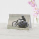 Um cartão de aniversário com uma fotografia de um traje de motocicleta vintage com uma cavaleira e passageiro competindo em uma corrida de grama anterior a 65