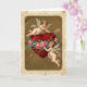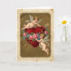 This greeting card shows a vintage-style picture with an aged gold background and a raised-looking frame around the edges. In the middle there’s a deep red heart filled with pink roses and small blue forget-me-nots. Above the heart, a chubby little cupid with rosy cheeks and pale pastel wings aims a tiny bow, and the golden arrow is already going through the heart with a bit of gold sparkle around it 💘. Below, another cupid with curly blond hair and a sweet, focused face reaches up toward the heart as if helping hold it in place. The colors stay soft and warm, with reds, pinks, greens, and light blue standing out against the worn gold backdrop. There isn’t any printed message visible on the front in this image, so the artwork does all the talking ❤️. It’s a sweet way to share Valentine’s Day feelings with someone you care about 😘.