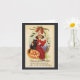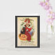 Uma dama vintage, vestida com uma fantasia vermelha de bruxa, está sentada em um jack-o-lanterna segurando seu gato preto. Dentro de texto: Feliz Hallowe'en. Imagem de um Cartão-postal Vintage sobre um fundo de cinza escura (quase preto).