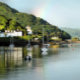 Depois de um dia de chuva, o sol finalmente sai e um arco-íris aparece no céu, nesta bela paisagem do porto de Aberdyfi no País de Gales, com barcos na água e algumas casas da vila.