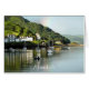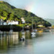 Depois de um dia de chuva, o sol finalmente sai e um arco-íris aparece no céu, nesta bela paisagem do porto de Aberdyfi no País de Gales, com barcos na água e algumas casas da vila.