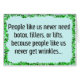 Esta carta engraçada é a nossa resposta a esta sociedade obcecada pela juventude em que vivemos. Ele diz, "Pessoas como nós nunca precisam de botox, enchedores, ou elevadores, porque pessoas como nós nunca têm rugas." Na dentro diz: "Temos linhas "F*ck You"." Envie esta carta engraçada para qualquer um que você conheça que esteja se preocupando com o processo de envelhecimento ou que esteja farto de tentar ficar eternamente 22 com a figura de um garoto pré-púbere. A propósito, esta é a versão limpa com o asterisco substituindo uma letra. Se quiser ver a outra versão, você precisará ser conectado ao Zazzle com uma conta PG-13.