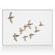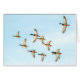 Dez patos-reais voam em formação através de um céu azul brilhante.