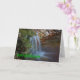 A Water Fall shot in the Fall with green moss, rocks and leaves shot close up that"s on a Birthday Card.
