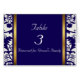 Cartão bonito do número da mesa da recepção de casamento feito nos azuis marinhos, no creme e no ouro. Um design azul e branco elegante do damasco em lados com uma listra da beira do ouro e em uma área de texto azul contínua. O texto é inteiramente customizável no estilo de pia batismal, nas cores, e nos tamanhos.