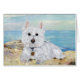 O pêssego macio e um mar turquesa fornecem um belo pano de fundo para este Terrier branco da West Highland em um passeio de praia! Mande saudações para seus amigos estilo Westie com beleza e cor! Todas as vendas apoiam o West Highland White Terrier Rescue!