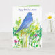 Um cartão conhecido feito sob encomenda do feliz aniversario decorado com um bluebird brilhante em uma planta do sagebrush com os wildflowers coloridos na mistura cor-de-rosa e roxa nas folhas tiradas com tinta e pintadas com aguarela. Você pode editar o texto para caber suas necessidades.