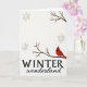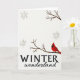 The words "WINTER wonderland" are written below in different fonts: "WINTER" is bold, and "wonderland" is more fancy. The mood of the card is peaceful, happy, and elegant. The cardinal's red color represents happiness and strength. This design combines simple graphics with meaning to create a cozy winter feel. It looks like a special handmade creation made with love.