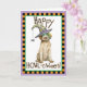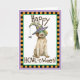 Mande saudações de Halloween com este cartão de um filhote Griffon giro vestindo uma máscara verde e um chapéu de bruxa decorado com uma aranha bobo. Excelente para crianças de todas as idades que amam Wirehaired Pointing Griffons e Halloween. Tenha uma boa HOWL-oggy!