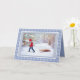 Um cartão terrestre de inverno com um menino e seu trenó, que pode ser personalizado. Apresenta uma bela imagem de inverno da floresta nevada.