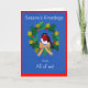 Um cartão de Natal com uma pilha de presentes de Natal e um pequeno rato a espreitar por detrás de um holly, de um design de colagem de papel pintado à mão por Judy Adamson. A saudação à frente, em letras brancas, é "Saudações de todos nós" e a dentro é deixada vazio para a sua própria mensagem.