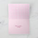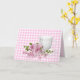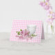 Xícara branca e pires com peonias cor-de-rosa e rotinas em forma de gingham rosa e branco. Por pensar em você.