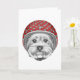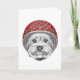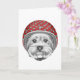 Este design apresenta um retrato de um Yorkshire Terrier vestindo um capacete pontilhado de polca vermelho e lacrado.
