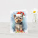 Design de Natal colorida e alegre com um Yorkshire Terrier vestindo um chapéu de Papai Noel.