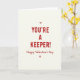 This greeting card delivers a loving message that’s easy to notice and hard to forget. Centered across the front, the words “YOU’RE A KEEPER!” appear in deep red block letters with a slightly textured look, giving them a warm, confident feel ❤️. The background is a soft off-white, which helps the message stand out without feeling harsh. Just above the main text sits a small hand-drawn red heart, adding a gentle touch of affection. Below, the phrase “Happy Valentine’s Day” is written in a smaller red script that feels friendly and sincere, with another small heart tucked underneath. The balanced layout and thoughtful details make this card feel like a sweet reminder worth holding onto. It’s a great choice for a partner or close friend when you want to say they truly matter and belong in your life