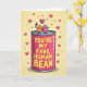 This greeting card shows a bright pink tin can in the center with two cute bean-shaped characters sitting on its rim. One bean is orange and smiling, and it holds up a small bouquet of pink and yellow flowers toward a rosy pink bean that smiles back. Both characters have simple dot eyes and wide, happy grins that make the moment feel sweet and friendly. On the front of the can, the message “YOU’RE MY FAVE HUMAN BEAN” appears in yellow block letters that are easy to read. A large magenta heart floats above them, and the background is a soft yellow with scattered small magenta hearts and little yellow stars. The overall setting feels like a simple, cheerful Valentine scene with a fun pun at the center ❤️