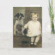 Escreva sua própria mensagem neste cartão com uma jovem criança que sustenta o pé do cão da família