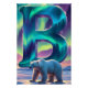 Preencha seu espaço com a beleza radiante do céu ártico com este pôster da letra Aurora B. Uma letra B luminosa se ergue acima de uma clareira na floresta nevada, iluminada por faixas turbilhonantes de luzes do norte turquesa, violeta e esmeralda. O céu irradia com cores cintilantes, lançando reflexos suaves sobre a neve e destacando o urso polar tranquilo que está perto da base do monograma.