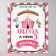 Sinal de boas-vindas do Circo, Vintage Carnival, poster. O sinal de boas-vindas do circo Vintage é perfeito para dar boas-vindas aos seus convidados na sua festa de aniversário do festival para raparigas e rapazes! Uma bela placa de festa para crianças com topo rosa, elefante, balões, coelho com chapéu e alguma decoração de circo. Basta editar este modelo fácil de usar no menu Personalização para torná-lo especial.