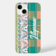 Uma impressão feminina de xadrez em pêssego de coral, verde e turquesa. Amarrado com um delicado local branco, com uma tartaruga e uma borda de pêssego.