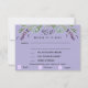 Um fundo violeta, texto preto. Decorado com flores de lavanda e verde de eucalipto. Personalize e adicione a resposta por seleção de data e menu. Voltar: Cor de fundo violeta. Adicione o url ao seu site de casamento para obter detalhes sobre o rsvp e/ou mais.
