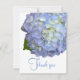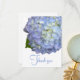 Cartão de agradecimento de flor de hortênsia plana. Flor de hortênsia azul clara com algumas folhagens em um fundo branco com texto azul “obrigado”. O verso é em branco, branco para uma mensagem pessoal ser escrita à mão. Escolha qualquer tamanho que funcione com este design floral e atualize o papel conforme preferido.