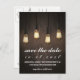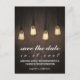 Cartões Chic de Salvar a Data com Luzes Rústicas Antigas - apresenta luzes pendentes industriais ou vintage sobre um fundo de madeira de celeiro. Veja a coleção completa de design correspondente nesta página.