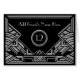Um cartão corajoso e elegante, do vintage do estilo do casamento da escolta com um tema grande Gatsby" dos anos 20 rujir de "em tons do preto e da prata. Um fundo preto destaca a geométrica intrincado, beira do estilo do art deco em tons do cinza de prata. Decorativas, as pias batismais do estilo do período foram selecionadas para o nome do seu convidado e a atribuição do número da mesa pode ser adicionada dentro do círculo limitado dobro.