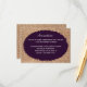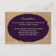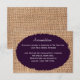 Este cartão de acomodação de casamento rústico em lona e roxo é perfeito para qualquer casamento campestre. Ele apresenta um fundo de lona com impressão rústica. A letra está sobre um oval roxo que tem bordas desgastadas. Perfeito para um casamento campestre ou num celeiro. A lona é apenas um desenho impresso. Não é tecido de lona real. Perfeito para o casal country western que usa lona e roxo em suas cores de casamento.