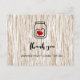 Cartões de agradecimento de pote de pedreiro com grãos de madeira de celeiro. Modelo de convite personalizado moderno com design rústico country chic. Arte linda para casamento de festa ao ar livre, celeiro ou jardim. Parte de um grande conjunto de coleção elegante com mais itens de papelaria sofisticados e acessórios bonitos. Textura de painel de madeira marrom com corações de amor desbotados e fofos e design de vidro de pote de pedreiro. Forma de recorte de vieira personalizável. Modelo de texto de tipografia de roteiro elegante e lindo. Adicione seus próprios nomes de noiva e noivo.