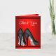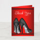 Cartões de agradecimento de sapato de salto alto preto e vermelho com sapatos de salto alto preto e prata elegantes em um belo fundo preto e vermelho. Esses cartões de agradecimento vermelhos e pretos podem ser personalizados com sua mensagem impressa ou deixados em branco para sua mensagem manuscrita quando chegarem.