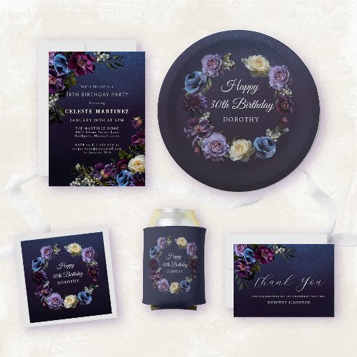 Um belo e elegante cartões de agradecimentos projetado especialmente para uma festa de aniversário de 30 anos. O elegante galho floral contém rosas roxos rústicos e peônias com pop de branco azul e rosa. O fundo escuro realmente mostra o texto branco. Faz parte da Coleção Floral Moody Purple. Ele contém todos os itens necessários para criar um pacote de artigos de papelaria bonito e exclusivo, suprimentos de festas e decorações.