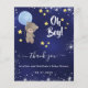 Um fundo azul marinho. A cor azul é irregular. Um ursinho de pelúcia segurando estrelas de balões azuis e reluzentes. Personalize e adicione nome(s) e uma data na frente. O nome e o texto: Oh Boy! são escritos com um estilo escrito manualmente Back: Obrigado nota e nome(s)